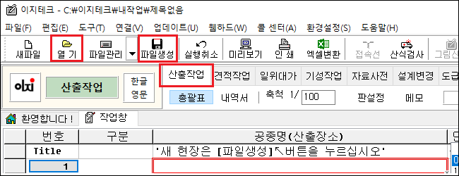 - 파일 이름에 작업할 파일명(현장 명)을 넣습니다. 가능한 파일명(경로포함) 짧게 작성 해주어야 합니다.