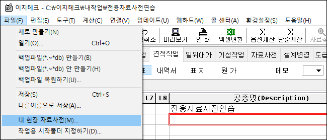 - [ 파일 ] – [ 내 현장 자료사전 ] 을 클릭합니다.