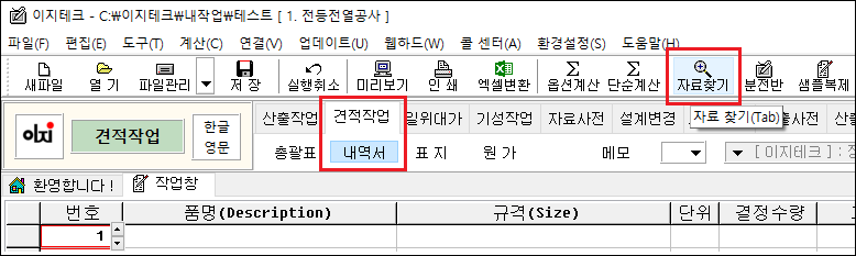 - 내역서(을지)에서 [ 자료찾기 ]를 누르거나 [ Tab ] 키를 누릅니다.